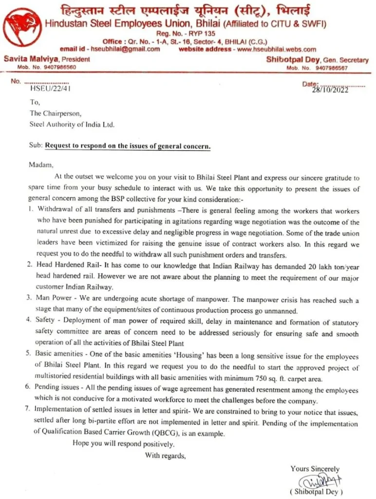 - भिलाई स्टील प्लांट की पूर्व मान्यता प्राप्त यूनियन सीटू ने कहा 28.10.2022 को तत्कालीन सेल अध्यक्ष सोमा मंडल को भिलाई में सौंपा था मांग पत्र।